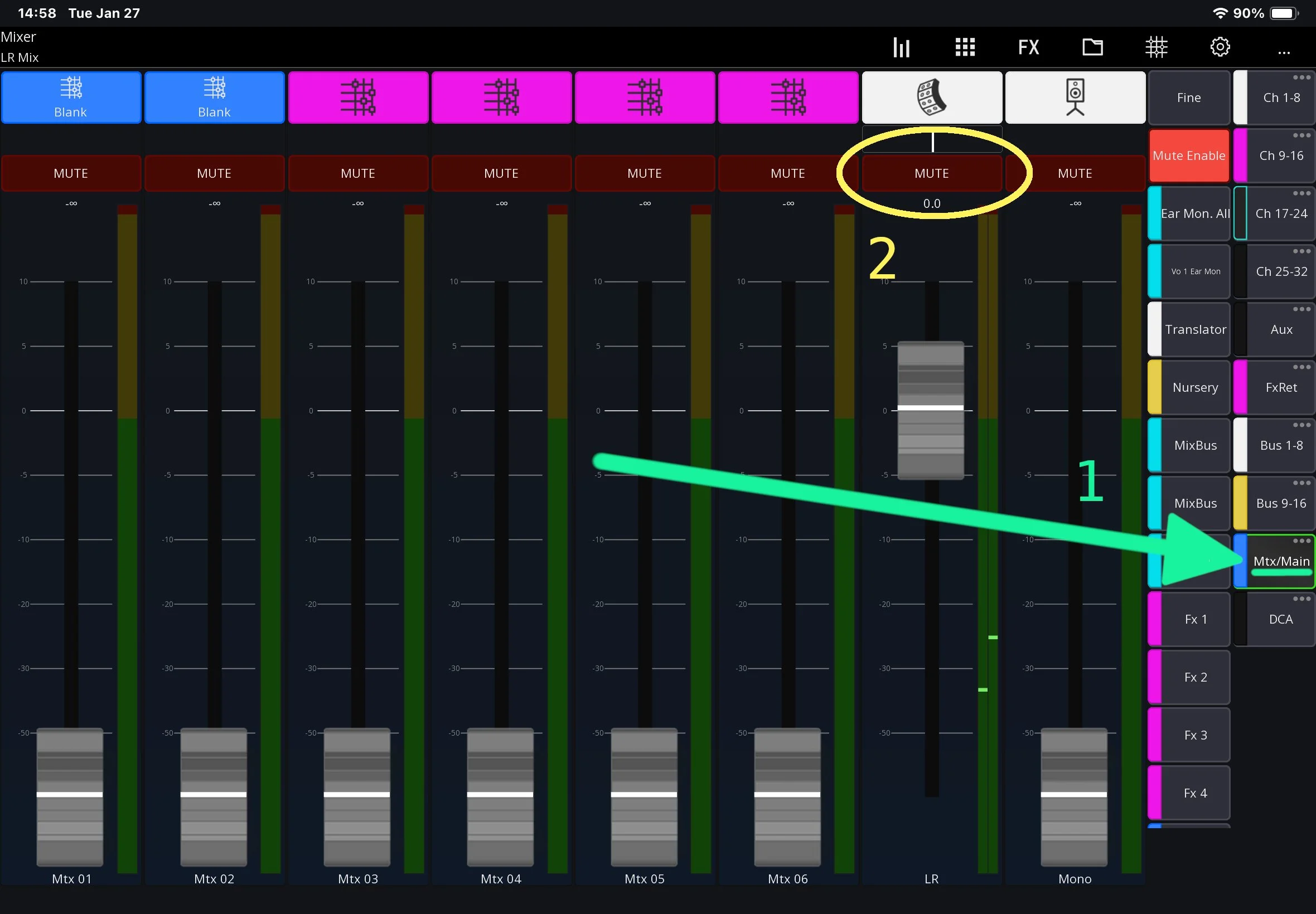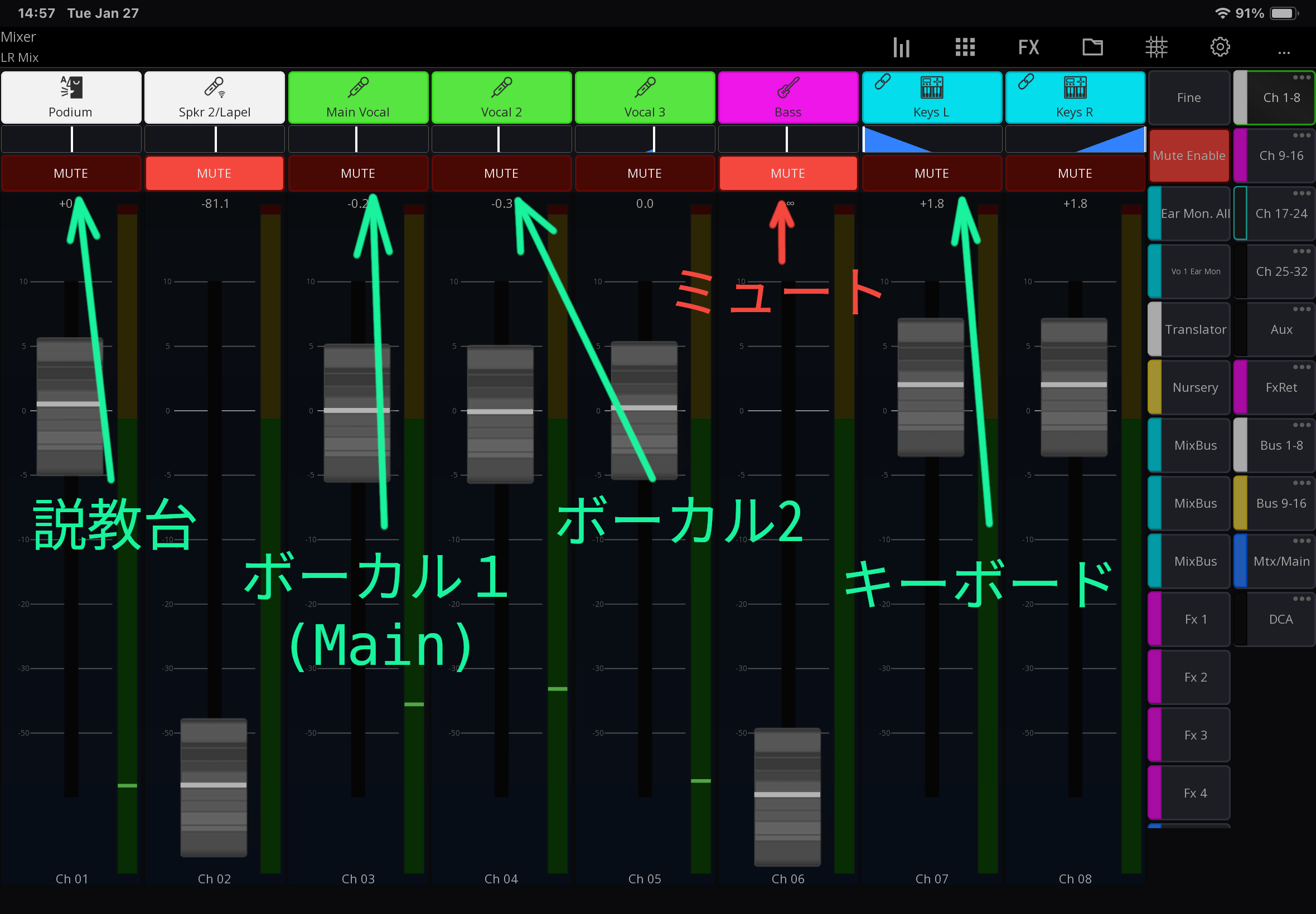 必要なチャンネル(説教台マイク、ボーカルマイク、キーボードなど)のミュートを解除する。