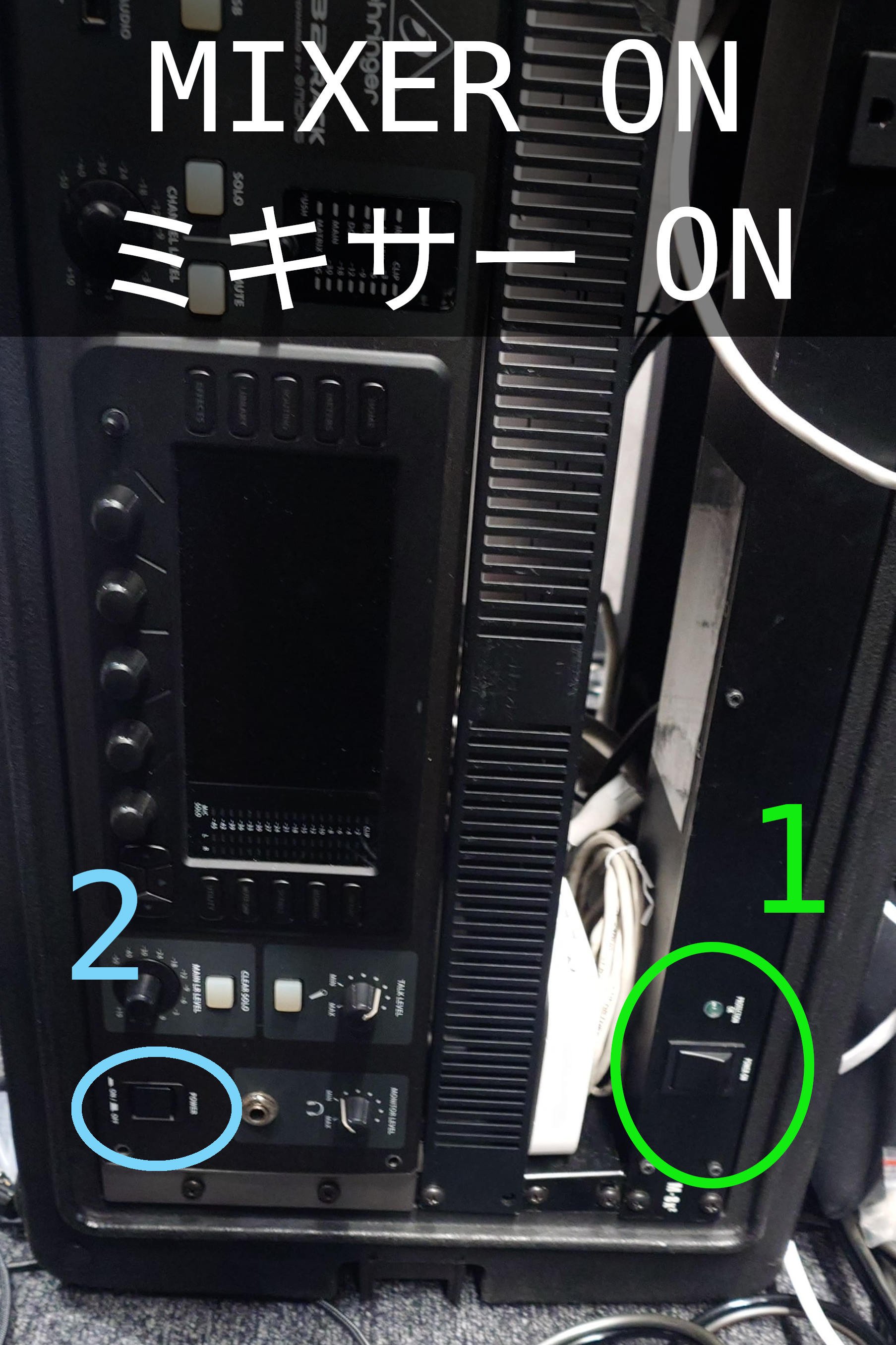 ミキサーを消す(スイッチ2をオフ ーー> スイッチ1をオフ)